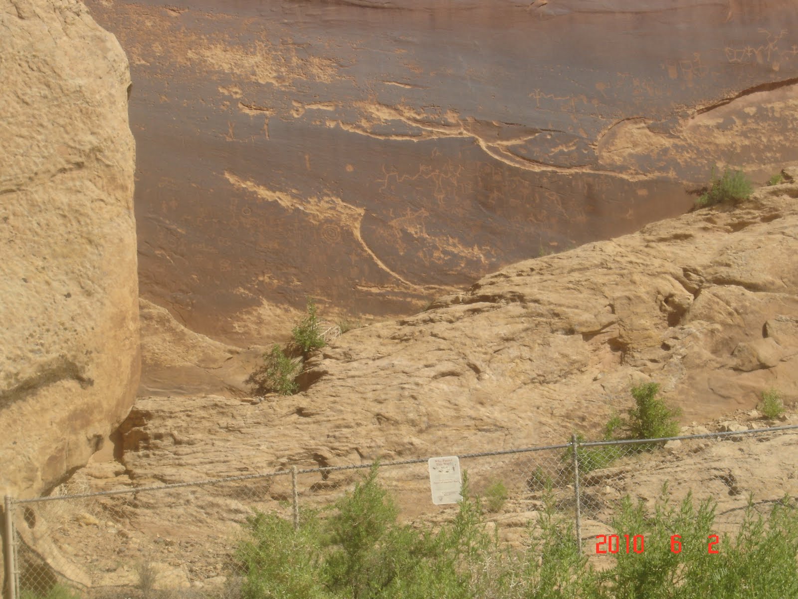 Then, about 2 miles outside of Bluff on the way to Monument Valley, we got another surprise. When we see a side road, Wayne always says "wonder where this little road goes?". Today, we took 'the little road' and we found petroglyphs on the side of a cliff. Look closely at the picture and you can see some of them. It was wonderful!